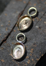 These bezel cups are ready to be set with your resin art, I also love using these to set my glass cabochons painted with alcohol ink! The bezel settings are cut from a sheet of metal, cleaned up, and then we solder on a loop. If you want the metal to retain it's finish you should lacquer it! Otherwise it will develop a natural antiqued finish. These are tiny oval shaped bezel charms.