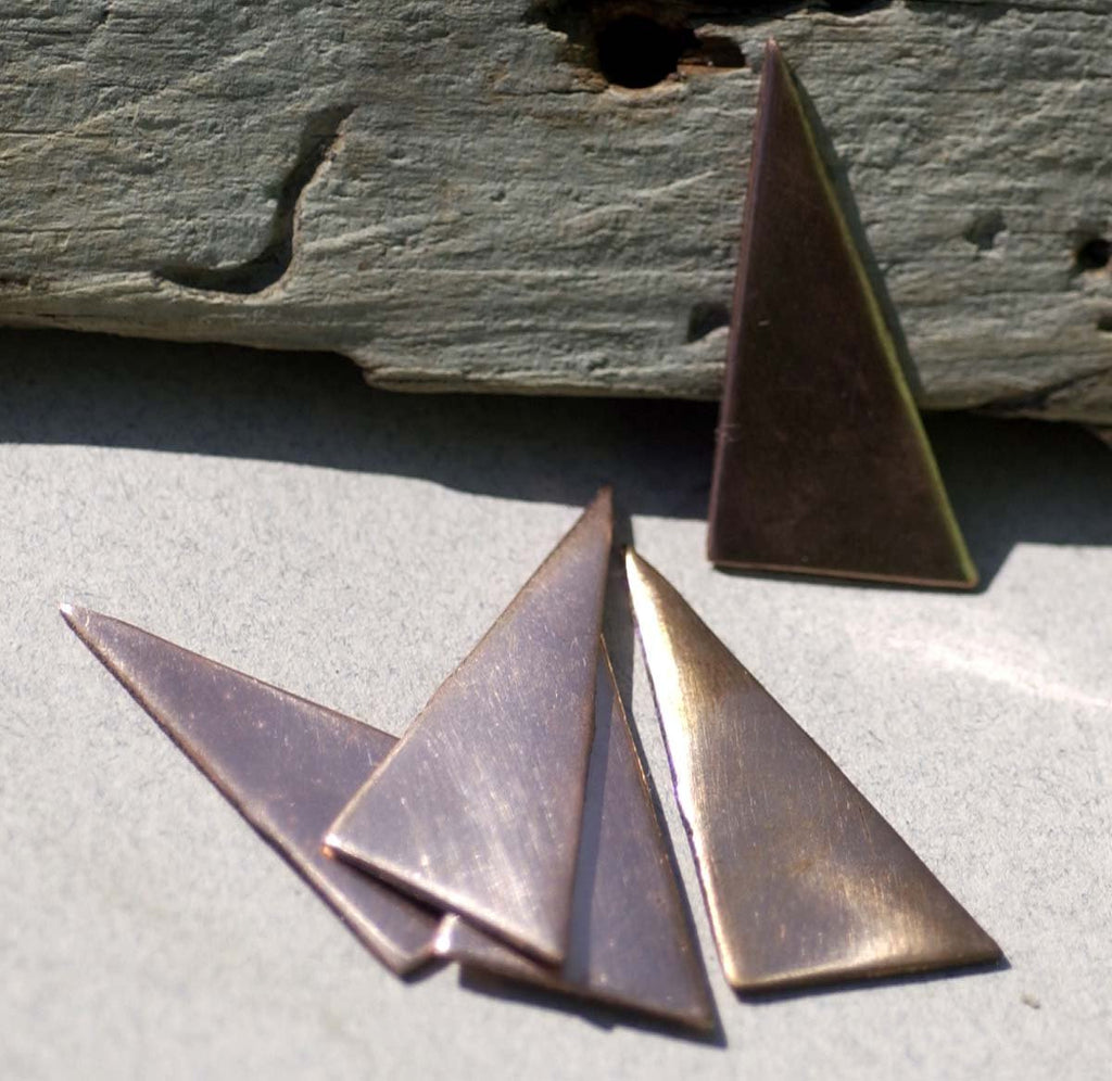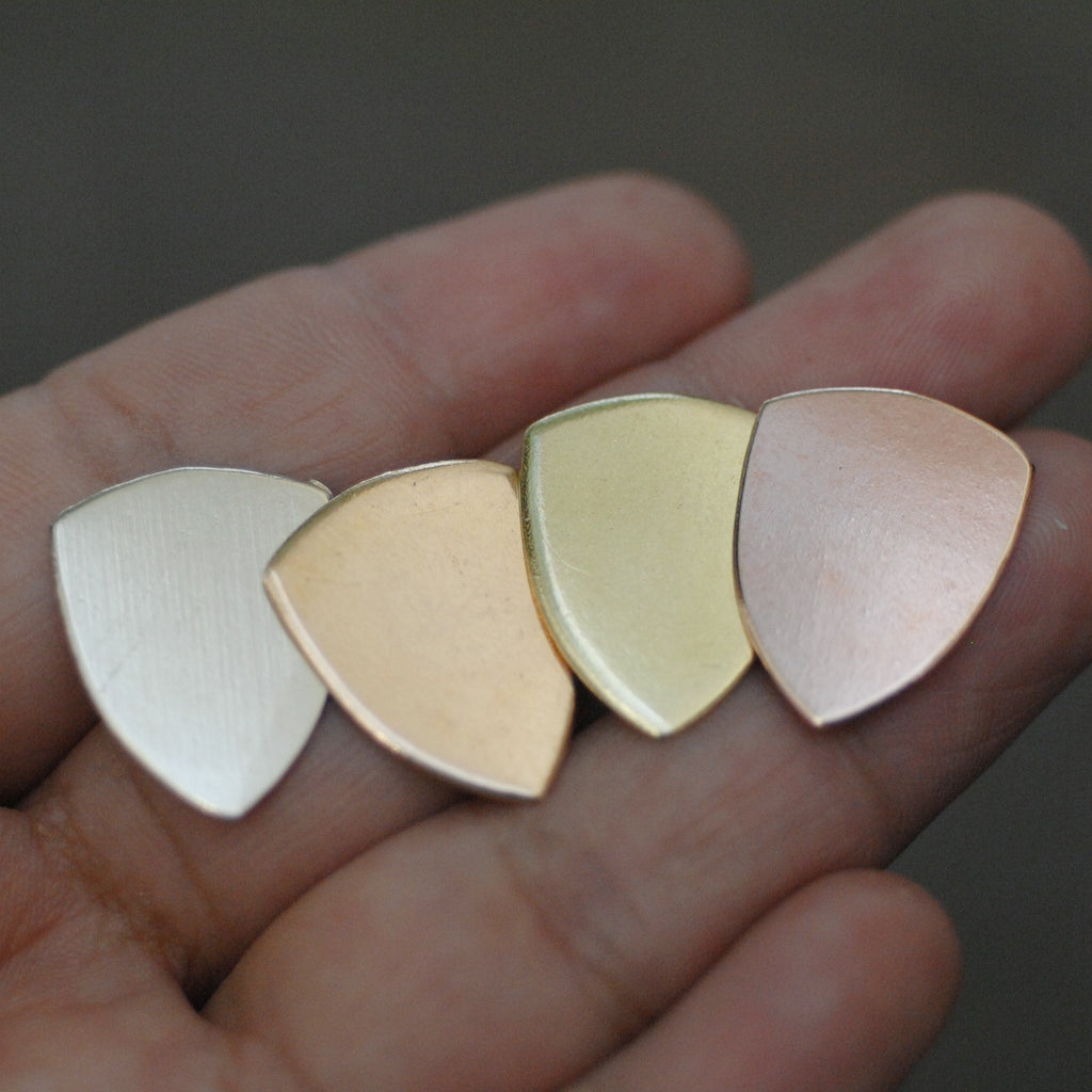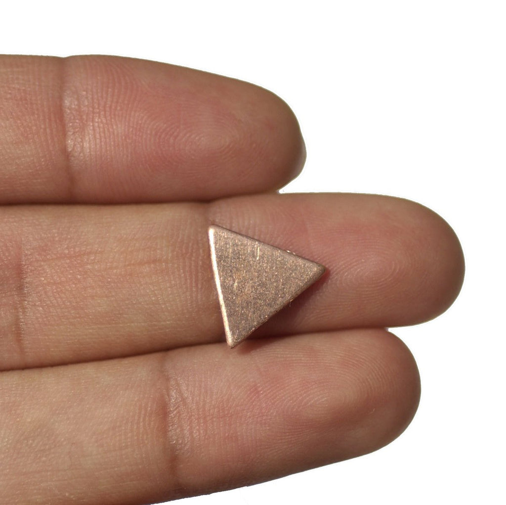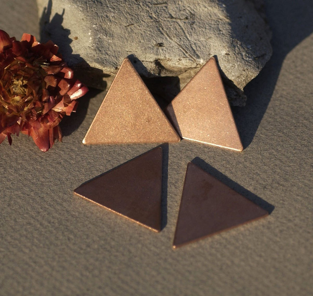 Our handmade Triangle shaped Jewelry blanks for hand stamping and jewelry making are high quality, cut from sheet metal, deburred, and cleaned. Make your own jewelry with our stamping blanks available in Copper, Brass, Bronze, and Nickel Silver. Most of our blanks are available in 26g, 24g, 22g, and 20g. These blanks have a nice smooth surface ideal for hand stamping. These can also be used as blanks for engraving after you finish the metal to your liking. Add your own holes with punching tools or ask us to cut custom holes for you. We are proud to be suppliers of high quality Jewelry Making Supplies. We make all our own products, so if you need another size or gauge just ask we are happy to help!