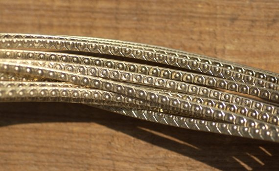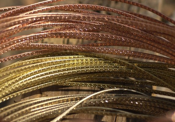 This is a nice sturdy ring stock or could be used to make charms for earrings, pendants, soldered onto bracelets, riveted into leather. The wire is flat on one side and covered in a geometric honeycomb on the other. The pattern also reminds be of bicycle tread!