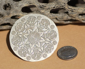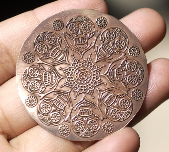 These metal disks are textured with our Sugar Skull pattern. Textured metal disks. This Artwork took me quite some time to do. These would make beautiful Pendant pieces.